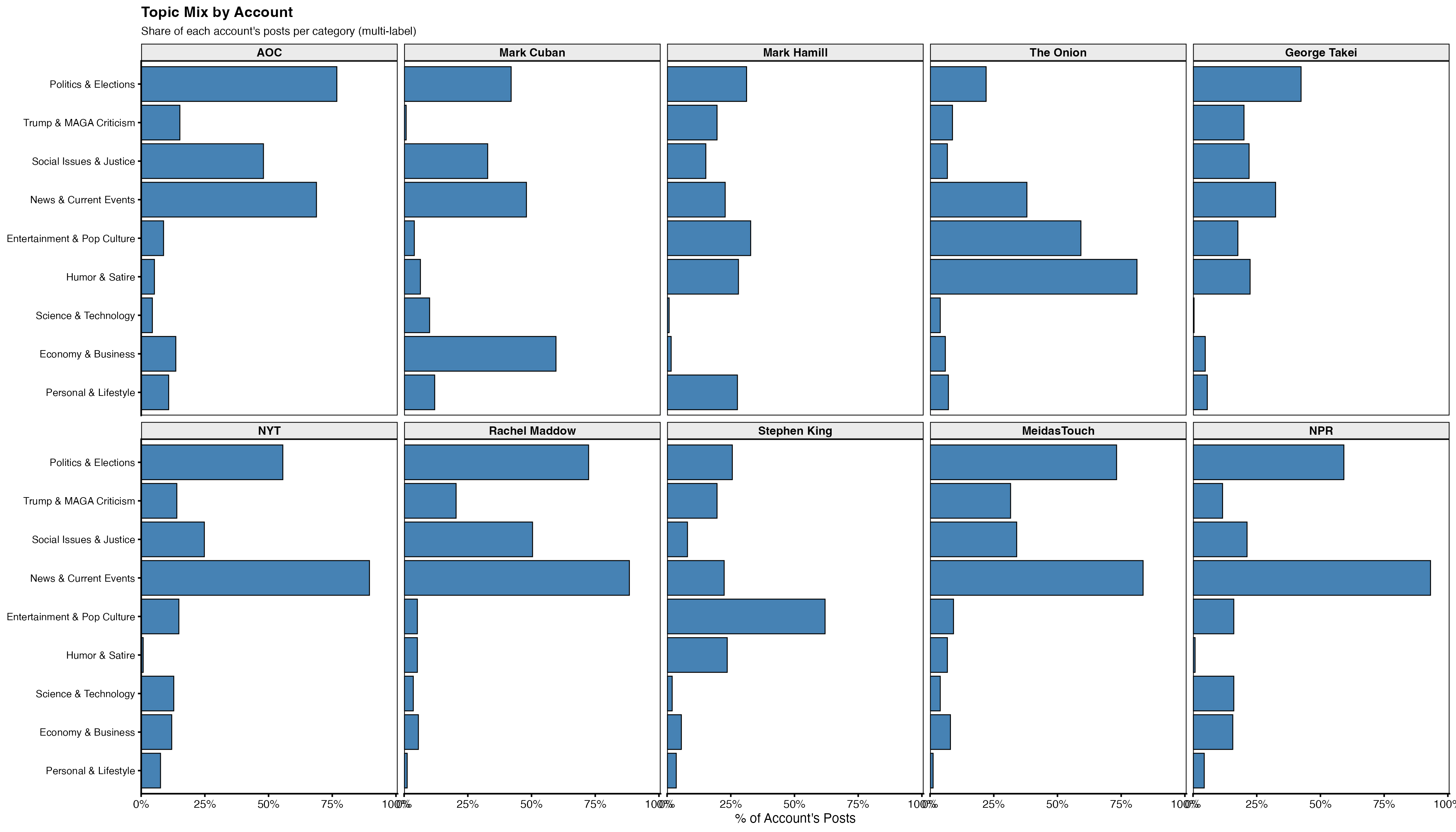 This one asks a broader question. I took the same classification pipeline and pointed it at ten of Bluesky’s most-followed accounts: AOC, Mark Cuban, Mark Hamill, The Onion, George Takei, The New York Times, Rachel Maddow, Stephen King, MeidasTouch, and NPR. These accounts span the ecosystem — a sitting congresswoman, a billionaire, a pop culture icon, a satirical news outlet, two major media organizations, an advocacy network, and a horror novelist. 250 posts per account, 2,500 posts total, all classified by GPT-4o-mini against a nine-category scheme.