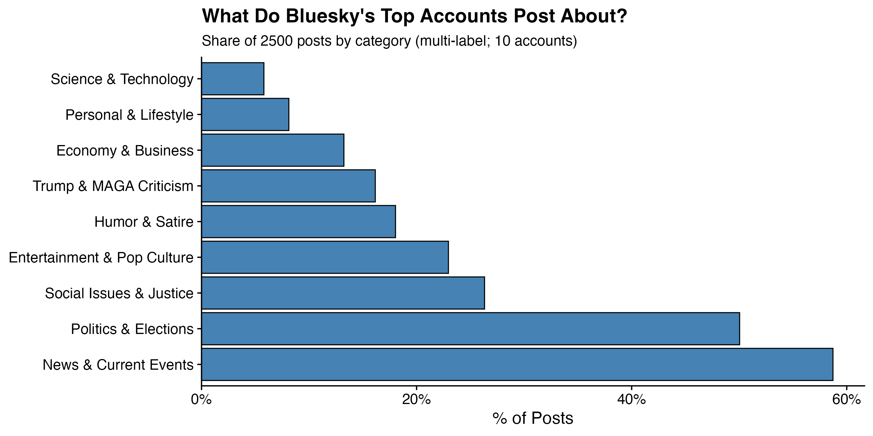The concentration at the top isn’t surprising for this particular set of accounts — these aren’t lifestyle influencers or tech reviewers. But the degree of dominance by News and Politics is still striking. More than half of what this slice of Bluesky produces is essentially political journalism or political commentary.