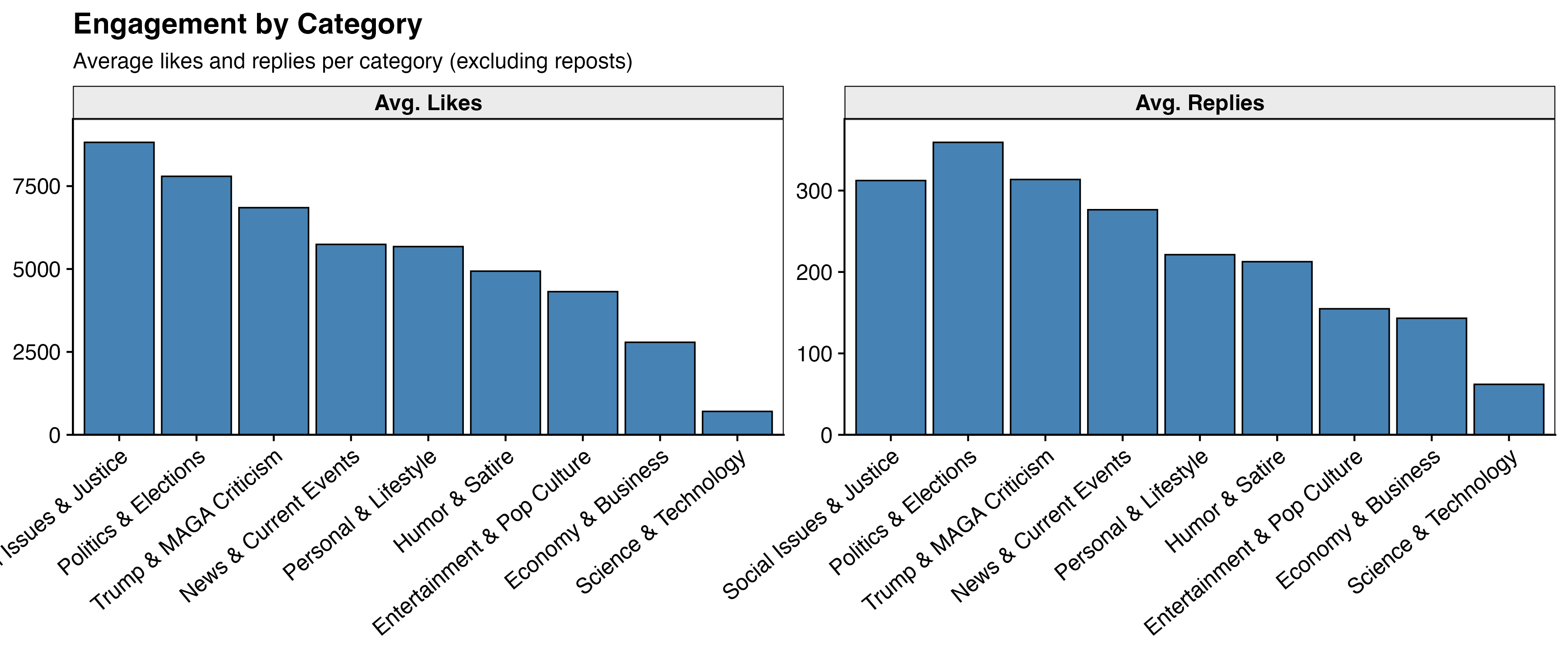 By category, the engagement hierarchy tells a clean story. Social Issues & Justice leads at 8,819 average likes per post, followed by Politics & Elections at 7,795 and Trump & MAGA Criticism at 6,849. Economy & Business posts average just 2,790 likes; Science & Technology posts average only 706 — by far the lowest of any category.