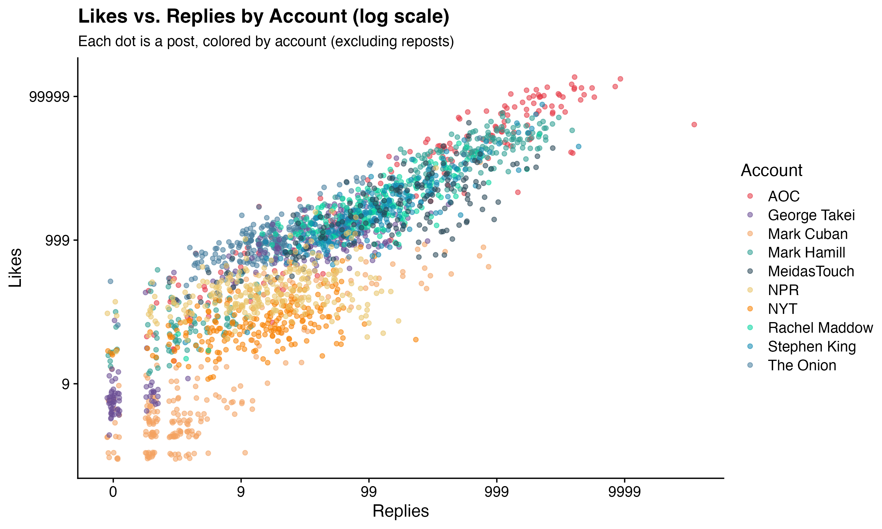 The scatter plot shows every original post (log scale) colored by account. The AOC cluster sits visibly higher and to the right than every other account — more likes and more replies. The media organizations (NYT, NPR) cluster near the bottom. Most posts across all accounts sit in the low-engagement zone regardless of content type; the viral outliers are rare and concentrated in a small number of accounts.