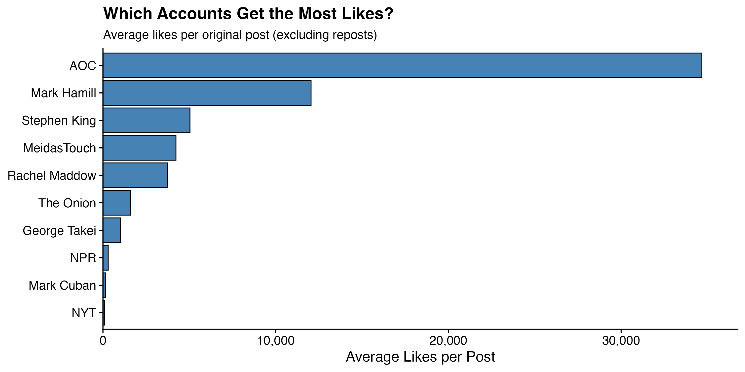 There is not a close race here. AOC averages 34,674 likes per post — more than twice the second-place Mark Hamill at 12,049. After that: Stephen King (5,039), MeidasTouch (4,226), Rachel Maddow (3,744), The Onion (1,598), George Takei (1,016), NPR (303), Mark Cuban (139), and NYT at 91.
