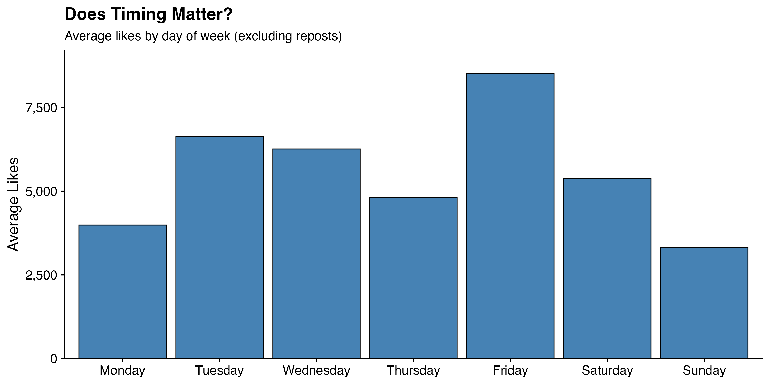 The spread across days is meaningful but not enormous compared to the account-level differences. Moving from Sunday to Friday would roughly double your average likes in this dataset. Moving from NPR to AOC would multiply them by about 380.