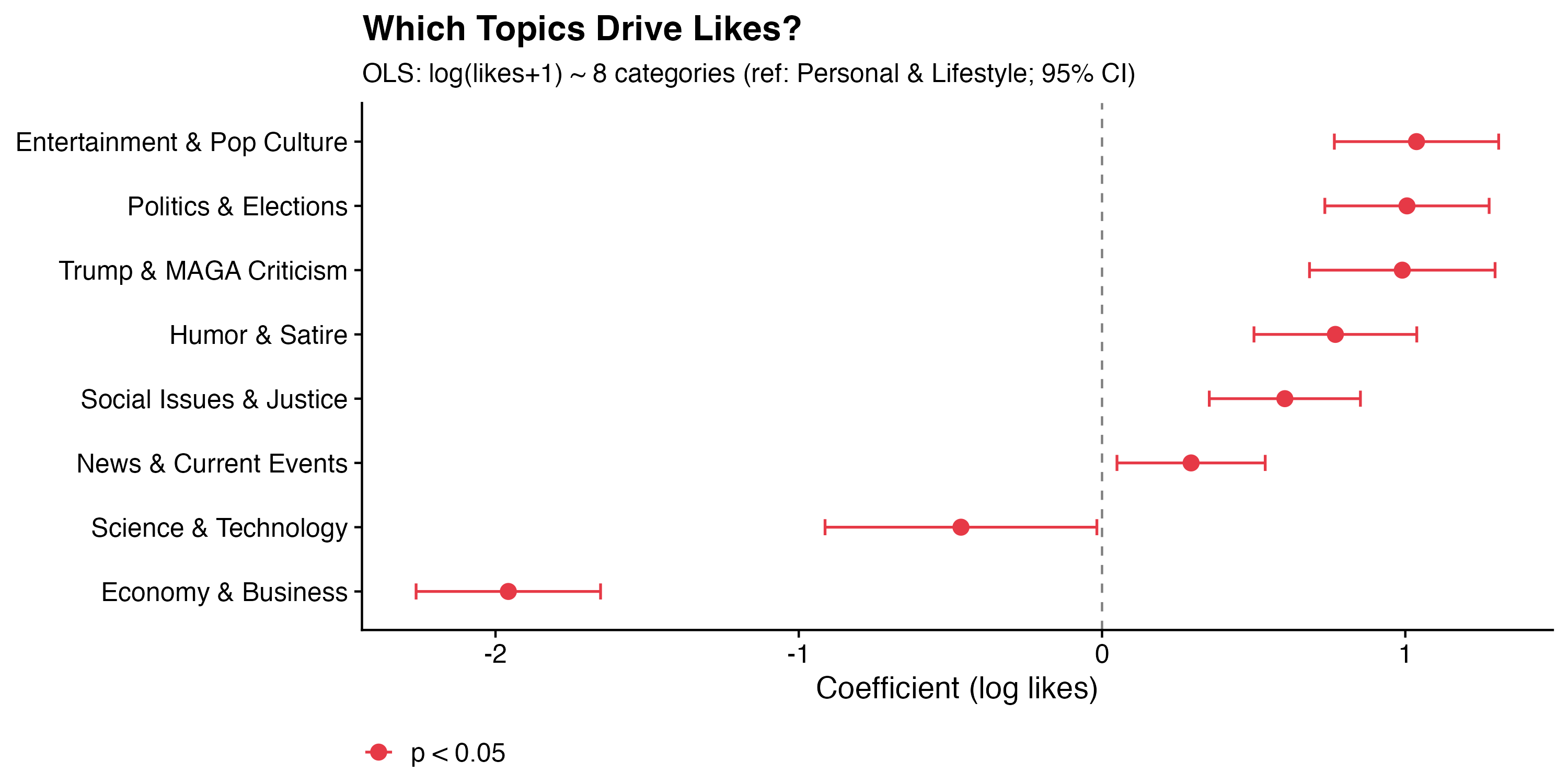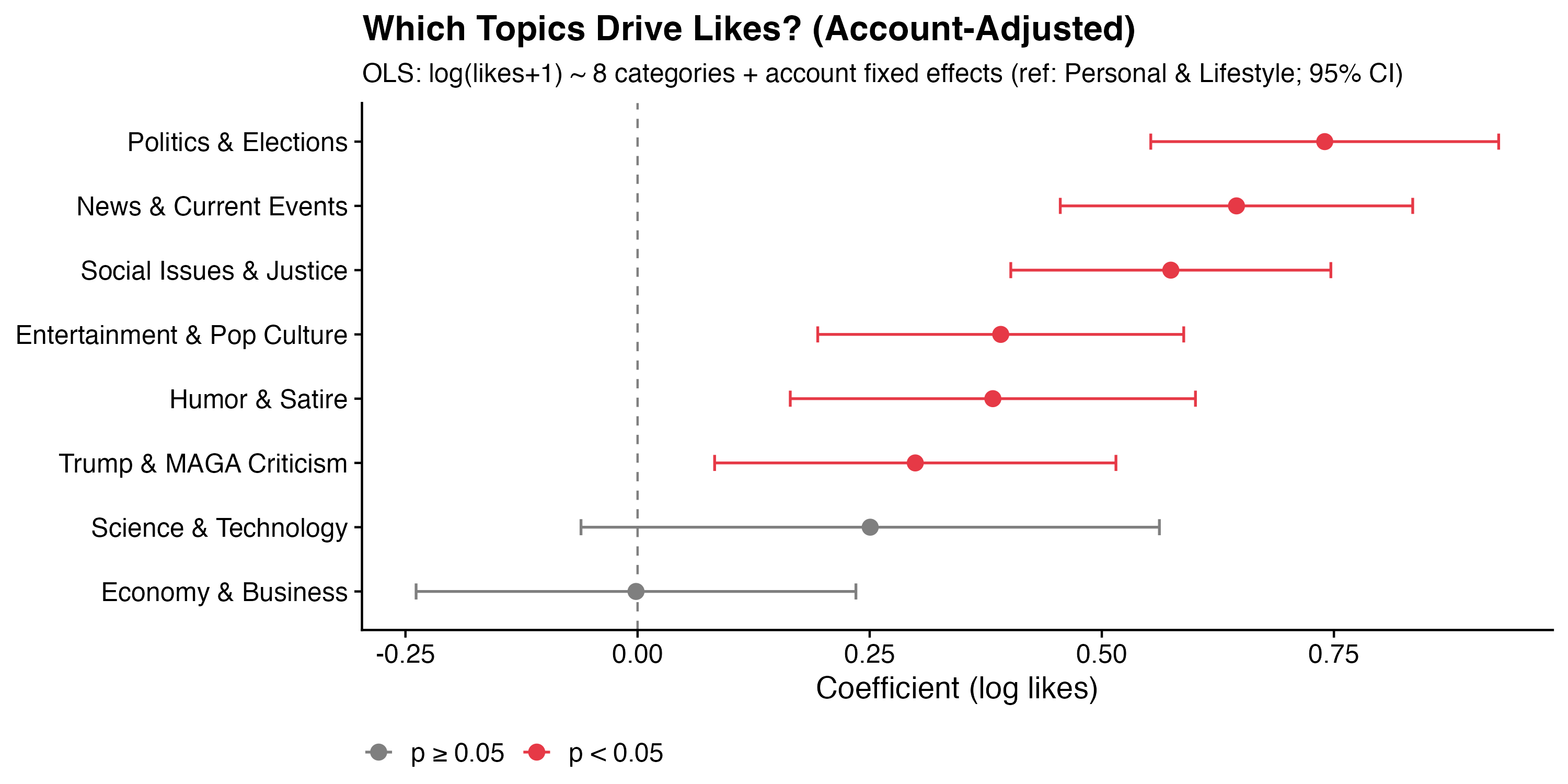 Most striking: Economy & Business goes from −1.96 to −0.002 (effectively zero, p = 0.99). The raw negative effect was entirely due to compositional differences between accounts — Cuban is the economy poster, and Cuban gets very few likes. Once you control for the account posting it, economics content performs no differently than personal content. The category itself isn’t the problem; the platform just happens to have its economics-focused account underperform on likes.