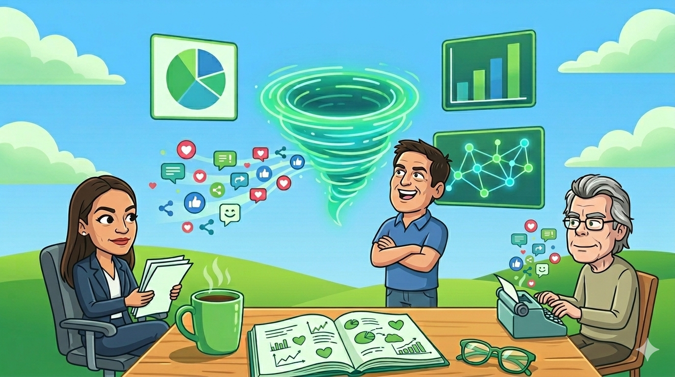 But engagement averages are heavily influenced by who posts in each category. AOC posts almost entirely in Politics and Social Issues; Mark Cuban posts almost entirely in Economy. These raw category averages are partly measuring account popularity, not content appeal in isolation.